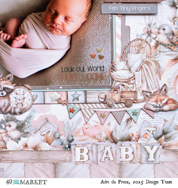 For this layout, I used the Dashing Paper. The giant gear and chain motif reflects a rugged, mechanical tone, ideal for portraying strength and character. The base page of my layout is Solid Sheet 1 from the Solids Collection Pack. I then trimmed the Dashing Paper down to 11.5x11.5" to make a frame around my layout.